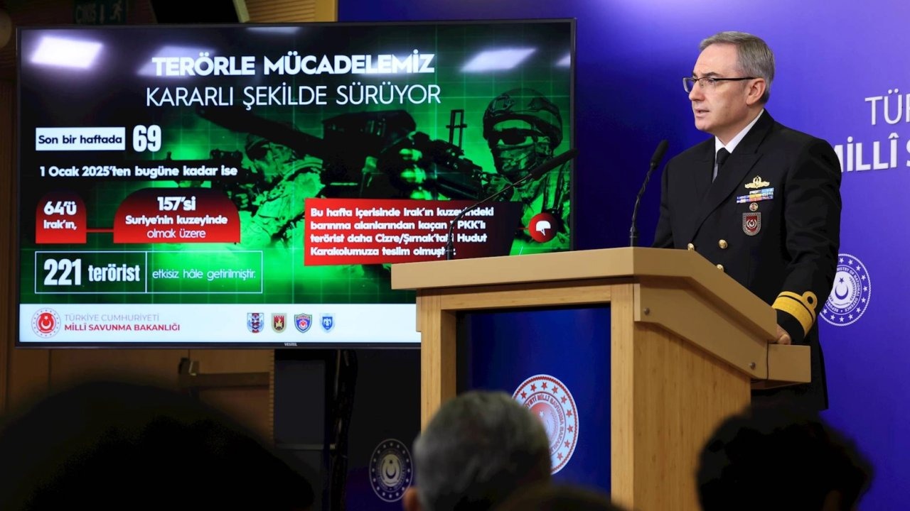 Basın ve Halkla İlişkiler Müşaviri ve Bakanlık Sözcüsü Tuğamiral Zeki Aktürk tarafından icra edilen toplantıda, PKK/PYD/YPG/SDG ve DEAŞ terör örgütleri başta olmak üzere her türlü tehdit ve tehlikeye karşı kesintisiz bir şekilde operasyonların başarıyla icra edildiğine dikkati çekilirken, son bir haftada 69, 1 Ocak'tan bugüne kadar ise 64’ü Irak’ın, 157’si Suriye’nin kuzeyinde olmak üzere 221 terörist etkisiz hâle getirildiği açıklandı.