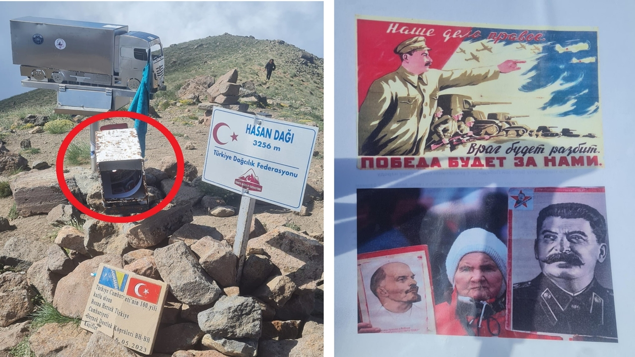 Dağın zirvesindeki Aksaray Mercedes fabrikasında üretilen Maket TIR’ın içine Sovyetler Birliği liderleri bulunan bir renkli afişi ile birlikte Rusça(Kiril alfabesi ile) ve Türkçe olarak” Büyük Zaferin 80. Yılında Sovyet Halklarına Saygıyla.