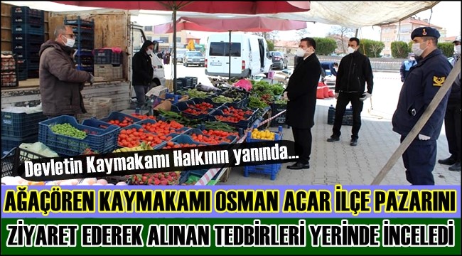 Korona virüs ile mücadele tedbirleri kapsamında Ağaçören Belediyesi ve İlçe Emniyet Amirliğince önlemler alınarak kurulan İlçe pazarını, Kaymakam Osman Acar, beraberinde İlçe Emniyet Amiri Ahmet Bağtır, İlçe Jandarma Komutanı Barış Ata ile birlikte, Ağaçören Pazarı'nda denetimlerde bulundu.