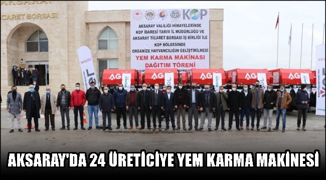 Aksaray’da “KOP Bölgesinde Organize Hayvancılığın Geliştirilmesi Projesi” kapsamında proje bütçesinin yüzde 30’nun Ticaret Borsası tarafından karşılanan, yüzde 70’i ise hibeli olan 24 adet yem karma makinesi düzenlenen törenle hak sahiplerine teslim edildi.