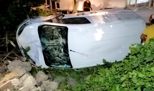 Kazanın etkisiyle sürücüsünün direksiyon hakimiyetini kaybettiği hafif ticari araç müstakil bir evin bahçesine düşerken, bahçedeki masada oturan aileye çarpmaya ramak kala durdu.