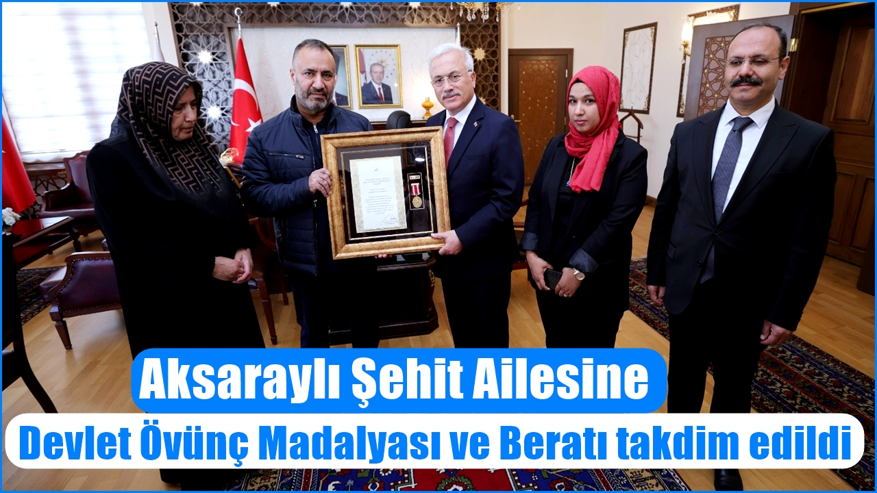 Aksaray Valisi Mehmet Ali Kumbuzoğlu Aksaraylı şehit Lokman Akçağlayan’ın ailesine “Devlet Övünç Madalyası ve Beratını takdim etti.