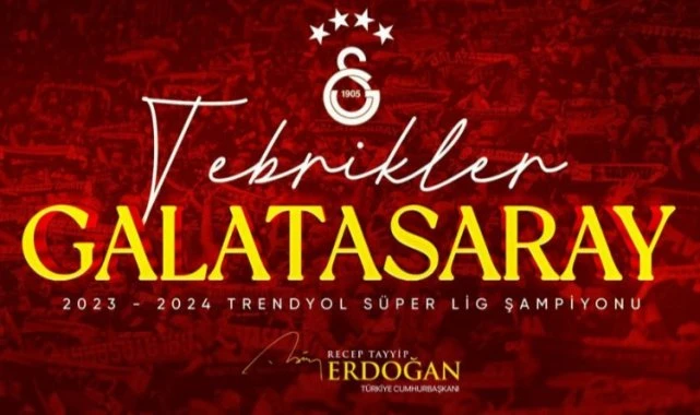 Cumhurbaşkanı Erdoğan, sosyal medya hesabından yaptığı paylaşımda, "2023-2024 Trendyol Süper Lig Şampiyonu Galatasaray'ı ve taraftarıyla birlikte tüm Galatasaray SK camiasını yürekten tebrik ediyorum." ifadelerini kullandı.