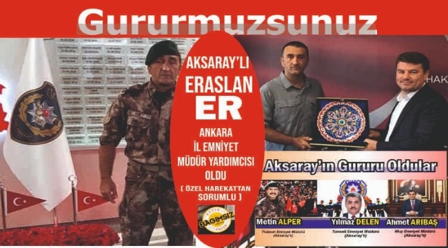 Ankara özel harekat daire başkanı olan Aksaray’lı Hemşerimiz Eraslan ER Ankara Emniyet Müdür Yardımcısı görevine getirildi. Özel Harekattan sorumlu olacak olan Hemşehrimiz son kararnamede Emniyet müdürlüğüne getirilen diğer hemşerilerimizin verdiği gururu daha yukarıya çekti.