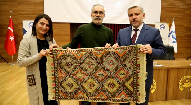 “Aksaray’da Halı-Kilim Dokumalarda Kullanılan Damgalar ve Tarihi Kökler” isimli etkinliğin açılışında bir selamlama konuşması yapan Rektör Şahin, gelenekli sanatların yaşatılması ve geniş kitlelerce bilinir hale gelmesi adına yapılan etkinlikleri önemsediklerini söyledi. Dokumaların kültür ve sanat bakımından son derece değerli ve pek çok mesajı barındıran ürünler olduğuna dikkat çeken Prof. Şahin, “Anadolu’daki pek çok hikâyede de yer aldığı üzere, halı, kilim ve çeyizler sadece yer örtüleri veya evlerde kullanılan diğer türden ürünler değildir. Bu ürünlerin üzerindeki motifler dokuyanın ruh durumu, talebi, konuşarak ifade edemediği duyguları hakkında karşıdakine bilgiler verir. Bu nedenle Anadolu dokumaları, somut görünürlüğün ötesinde başka duygulara da karşılık gelen özelliklere sahiptir. Hatta bu özellikler bazı türkülere de ilham olmuştur…” dedi. ASÜ Rektörü, konuşmasının ardından, Fatih Kısaparmak’ın “Kilim” isimli eserinden bir bölümü, öğrencilerin de eşliğiyle seslendirdi.