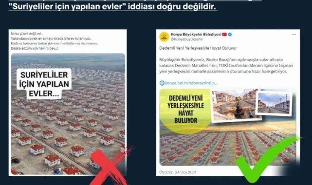 Konya Büyükşehir Belediyesi'nin 'Dedemli Yeni Yerleşkesiyle Hayat Buluyor' başlığıyla 24 Ocak 2021 tarihinde hem internet sitesinde hem resmi sosyal medya hesabında konuyla ilgili açıklamalarda bulunduğu tespit edildiğinin belirtildiği açıklamada, "Mahalle sakinleri için Meram ilçesi Çarıklar Mahallesi'nde TOKİ tarafından yapılan 428 adet konut 4 Eylül 2021'de çekilişle hak sahiplerine verilmiştir. Asılsız iddialara itibar etmeyiniz" ifadeleri yer aldı.