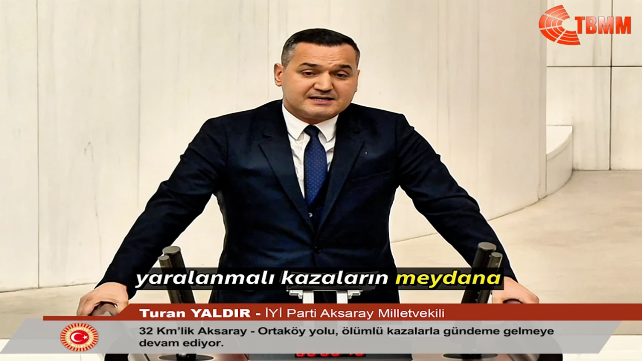 Türkiye Büyük Millet Meclisi (TBMM) Genel Kurulu’nda söz alan İYİ Parti Aksaray Milletvekili Turan Yaldır, yıllardır bitirilemeyen Aksaray-Ortaköy yolunu gündeme taşıdı. Yaldır, 2015 yılında ihalesi yapılan ve uzunluğu yalnızca 32 km olan bu yolun, tamamlanması gereken tarih olan 7 Şubat 2025’e rağmen hâlâ bitirilemediğini vurgulayarak, yolun "ölüm yolu" olarak anılmasına neden olan ihmallere dikkat çekti.