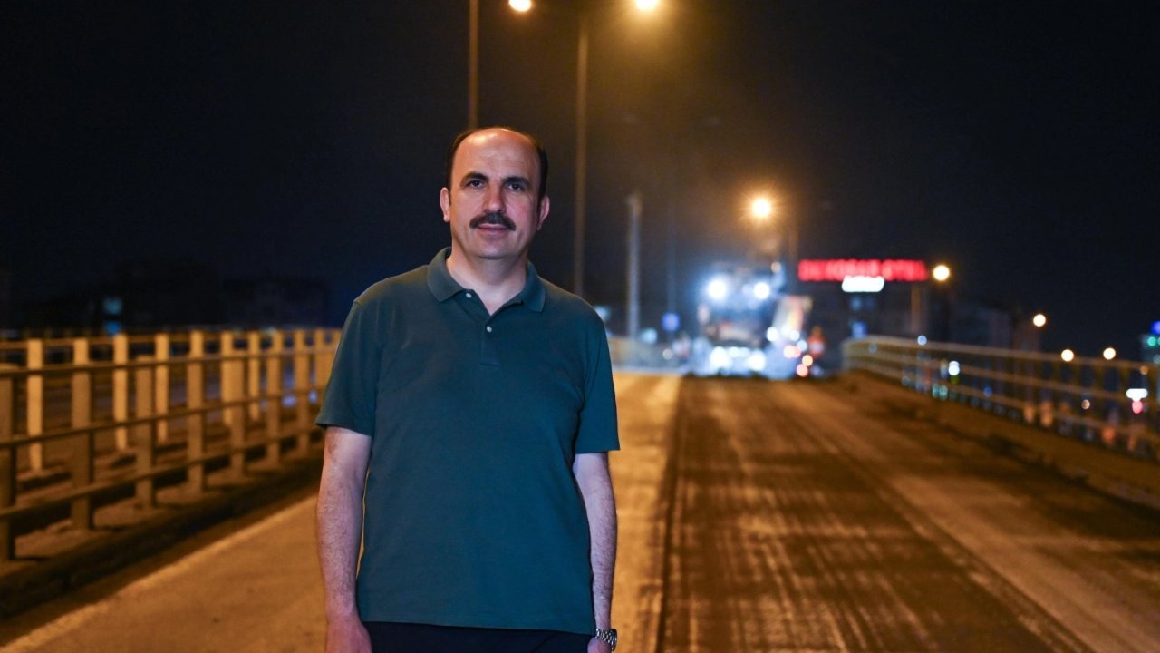 Konya’nın en yoğun kavşaklarından biri olan Koyuncu Köprülü Kavşağı’nda da asfalt yenileme çalışması başlattıklarını ifade eden Başkan Altay, “Üst geçitte arkadaşlarımız yoğun bir şekilde çalışıyor. Şu anda saat 11.35. Sabah 06.00’ya kadar buradaki çalışmaları tamamlamak için 30 araç ekipman ve çalışanlarımızla yoğun bir gayret içerisindeyiz. Amaç günlük trafiği rahatsız etmeden şehrimizi yenilemek. İnşallah şehrimizdeki bu çalışmaları sezon boyunca devam ettirip Konyalılara daha konforlu bir ulaşım sağlamayı hedefliyoruz. Gecenin bu saatinde yoğun bir gayret gösteren tüm çalışma arkadaşlarıma teşekkür ediyor, kolaylıklar diliyorum” diye konuştu.