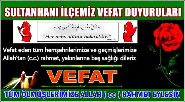 Sultanhanı ilçemizden ve Gurbetteki Halkımızdan Hakkın Rahmetine Kavuşmuş Merhum ve Merhumeler'i Bilgimiz Dahilinde Buradan Hemşehrilerimize Duyuruyoruz,