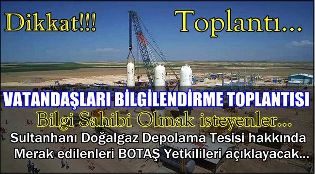 Cumhurbaşkanı Recep Tayyip Erdoğan'ın Cuma günü açılışını yaptığı ve 5 Katına kadar büyütüleceğini açıkladığı Sultanhanı Tuzgölü yeraltı Doğalgaz depolama Tesisi Hakkında vatandaşlara bilgilendirme toplantısı düzenlenecek.