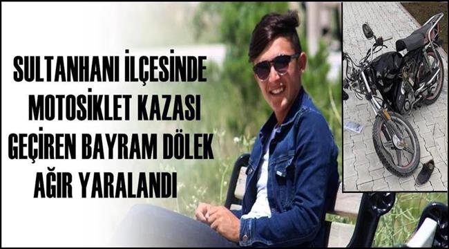 Dün Öğle saatlerinde Sultanhanı ilçesi Zafer mahallesinde bulunan Otobüs Terminali karşısında Kullandığı Motosiklet ile Nail K. (32) idaresindeki 68 HT 555 Plakalı otomobil ile çarpışan Bayram Dölek (18) Ağır yaralandı. Haber verilmesi ile ilk yardım ekiplerince ilk Müdahalenin ardından Aksaray Eğitim ve Araştırma hastanesine kaldırılan 18 Yaşındaki Bayram Dölek Yoğun bakımda tedavi altına alındı.