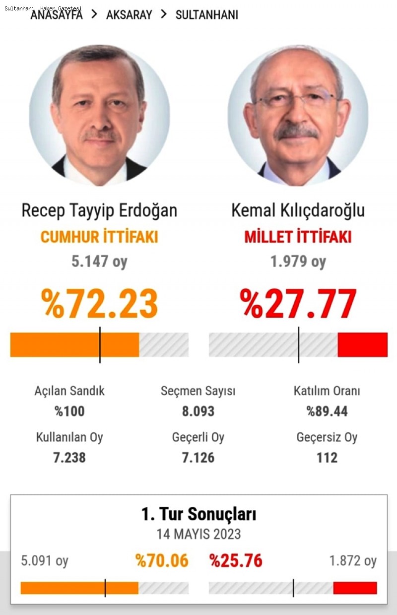 Sultanhanı ilçesinde ise Resmi olmayan Kesin sonuçlar şu şekilde oldu.