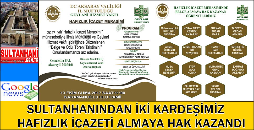 Konuya ilişkin alınan bilgide Aksaray İl müftülüğü ve Ceylani Hizmet vaktı tarafından Ortaklaşa Gerçekleştirilecek Merasimle 14 Öğrenciye Hafızlık belgeleri verilecek. Bu 14 Öğrenciden 2 si Sultanhanı ilçemizden. İlçemizden Ahmet Özdemir ve Hanifi Sarı da Hafizlık icazet Merasiminde belge almaya hak kazandılar.