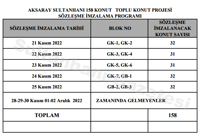 Toplu Konut İdaresi Başkanlığı (TOKİ) tarafından 100.000 Sosyal Konut Projesi kapsamında, AKSARAY SULTANHANI Projesi’nde inşa ettirilen; 158 adet konut için Konut Belirleme Kurası 08 Kasım 2022 Saat 11:30’da gerçekleştirilmiş olup, Gayrimenkul Satış Sözleşmesi hak sahipleri tarafından 21 – 25 Kasım 2022 tarihleri arasında T.C. Ziraat Bankası Aksaray Sultanhanı Şubesi’nde imzalanacaktır.